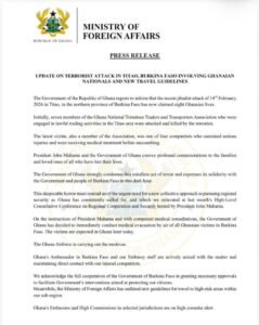 Ghana’s Ambassador to Burkina Faso, together with embassy officials, is on the ground coordinating assistance and maintaining direct contact with affected nationals. The Government of Ghana also acknowledged the cooperation of Burkinabe authorities in facilitating the evacuation and related interventions.