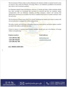 Ghanaians already residing in areas prone to extremist attacks have been advised to limit movement, stay in regular contact with Ghanaian embassies, keep emergency contact details updated, and ensure identification documents are readily accessible to enable swift consular support.