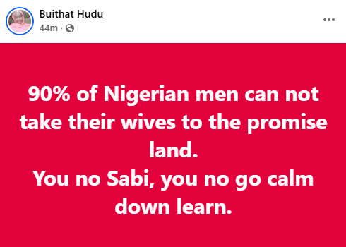 90% of Nigerian men cannot take their wives to the ‘promised land’ – Nigerian woman says