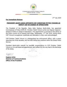 The statement by the Jubilee House Director of Communications described the Commissioner as a distinguished law enforcement officer with a career spanning over three decades who has held key positions within the Service.
