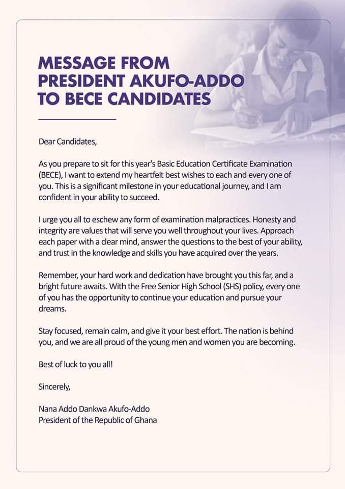Ghanaian President, Nana Akufo-Addo, has urged pupils who are writing the Basic Education Certificate Examination (BECE) across Ghana from July 8, to July 15, to eschew any form of examination malpractices.