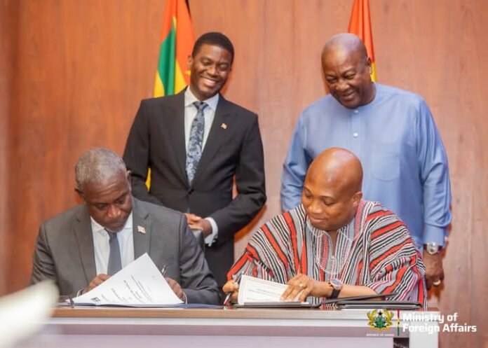 Samuel Okudzeto Ablakwa (right) signing a bilateral agreement with his Grenada counterpart at the Jubilee House in Accra on Friday, October 17, 2025 as Prime Minister Dickon Mitchell (left) and President John Dramani Mahama (right) look on
