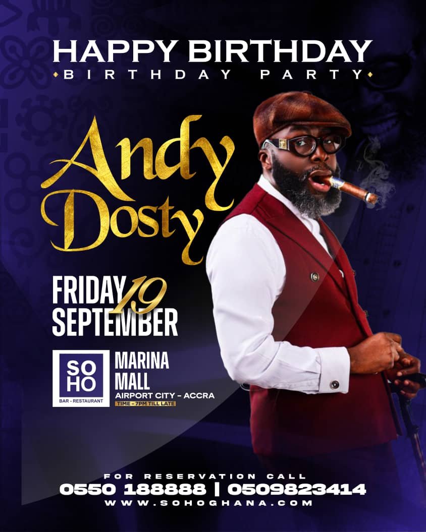 Renowned Ghanaian disc jockey and radio personality, Andy Dosty, is set to celebrate his birthday in grand style at Soho, Marina Mall, located in Airport City, Accra.