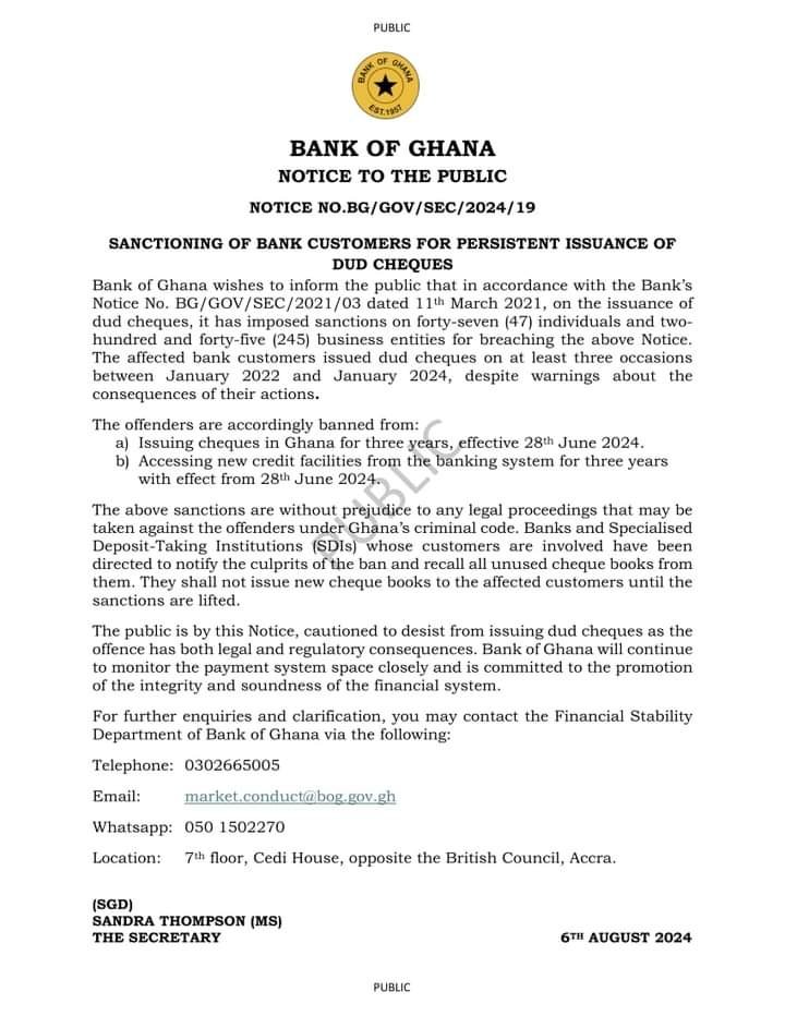The Central Bank of Ghana (BoG) has banned 47 Individuals and 245 business entities from issuing cheques and accessing new credit facilities for the next three years for persistly issuing dud cheques.