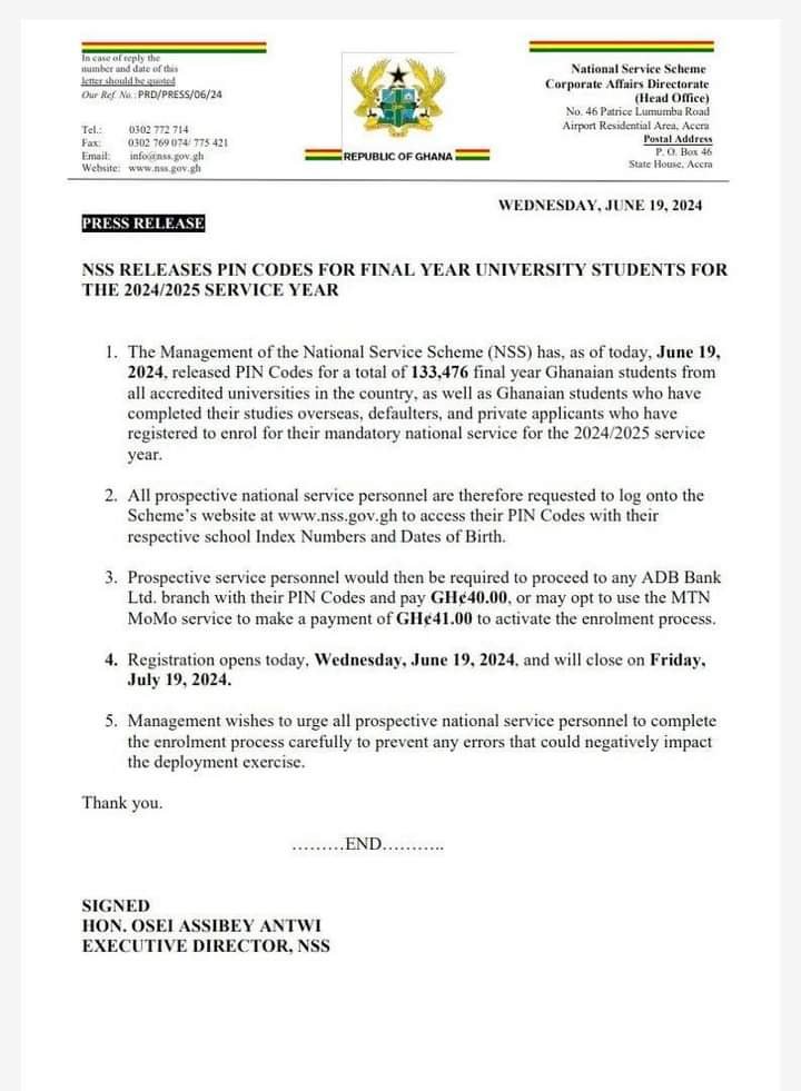 The NSS, in the statement, announced should pay between Ghc 40 and Ghc 41 for their enrollment process to be activated, saying that “registration opens today, Wednesday, June 19, 2024, and will close on Friday, June 19, 2024.”