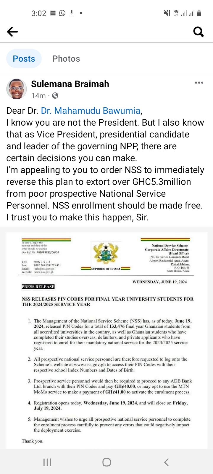 But in his social media post seen by Ghanaija, Mr. Braimah appealed to Dr. Bawumia “to order NSS to immediately reverse this plan to extort over Ghc 5.3 million from poor prospective National Service Personnel.”