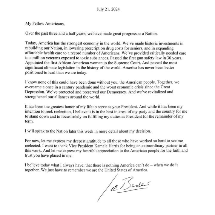 He wrote: “My fellow Democrats, I have decided not to accept the nomination and to focus all my energies on my duties as President for the remainder of my term.”
