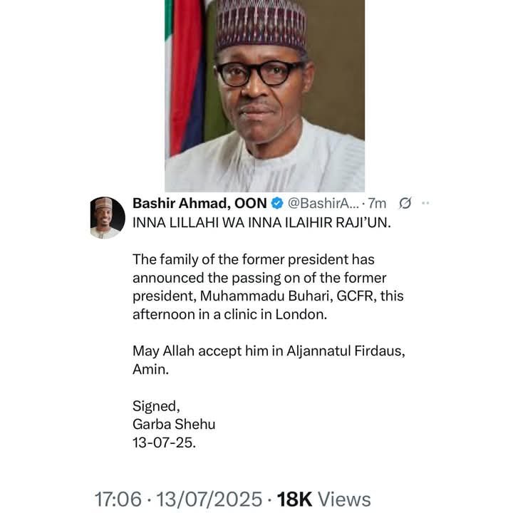 “The family of the former president has announced the passing on of the former president, Muhammadu Buhari, GCFR, this afternoon in a clinic in London. May Allah accept him in Aljannatul Firdaus, Amin,” Garba Shehu, a former spokesman to President Buhari, wrote on X.