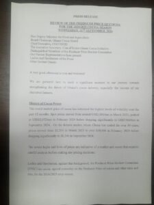 “The Producer Price Review Committee (PPRC) on cocoa agreed on Tuesday on the Producer Price of cocoa and other rates and fees for the 2024/2025 crop season.”