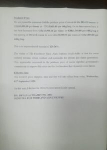 The Minister of Food and Agriculture, Dr Bryan Acheampong, has announced a 129.36% increase in the producer price of cocoa for the 2024/2025 cocoa season, effective Wednesday, September 11, 2024.