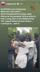Sharing photos of herself with Rema on her Instagram story, DJ Cuppy highlighted his impressive records. This includes the most streamed African song, his historic achievement as the youngest African artist to chart a song on the Billboard Hot 100, and his success in topping the Global Shazam Charts.
