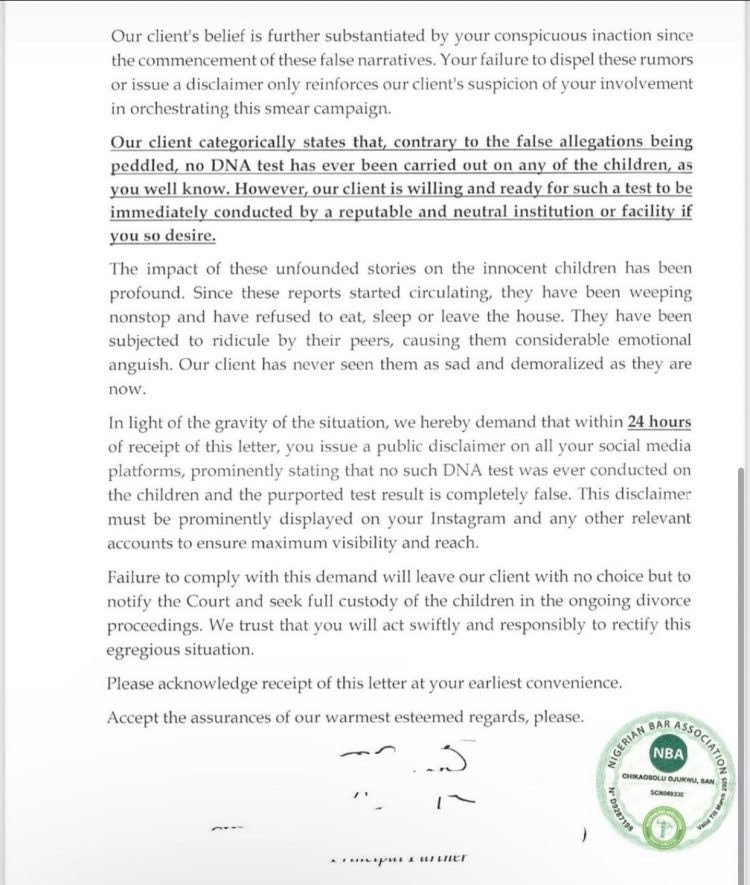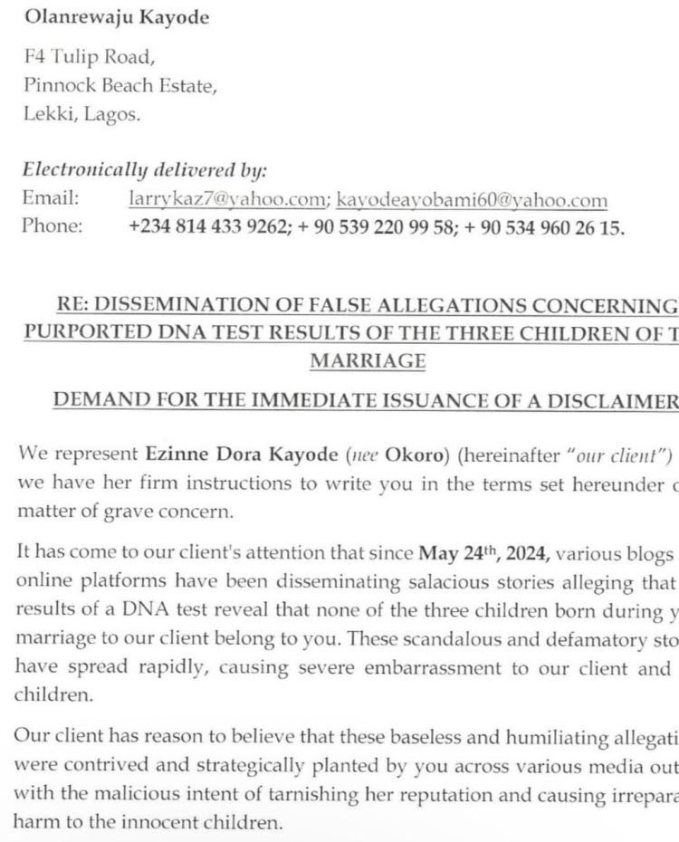 The children in question are Jayden, Jason and Jamin. According to Dora in her letter, “no DNA test has ever been carried out on any of the children, as you [Kayode Olanrewaju] well know. However, our client is willing and ready for such a test to be immediately conducted by a reputable and neutral instituition or facility if you so desire”.