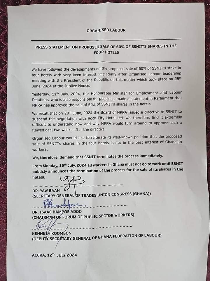 Organized Labour has urged all workers in Ghana not to go work from Monday, 15th July, 2024, until Ghana’s Social Security and National Insurance Trust (SSNIT) publicly announces the termination of the sale of its shares in a number of hotels.