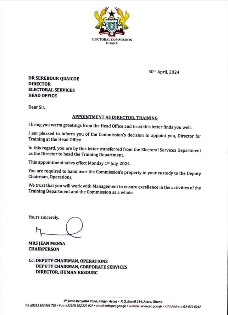 “In this regard, you are by this letter transferred from the Electoral Services Department as the Director to head the Training Department,” an excerpt of the letter said.