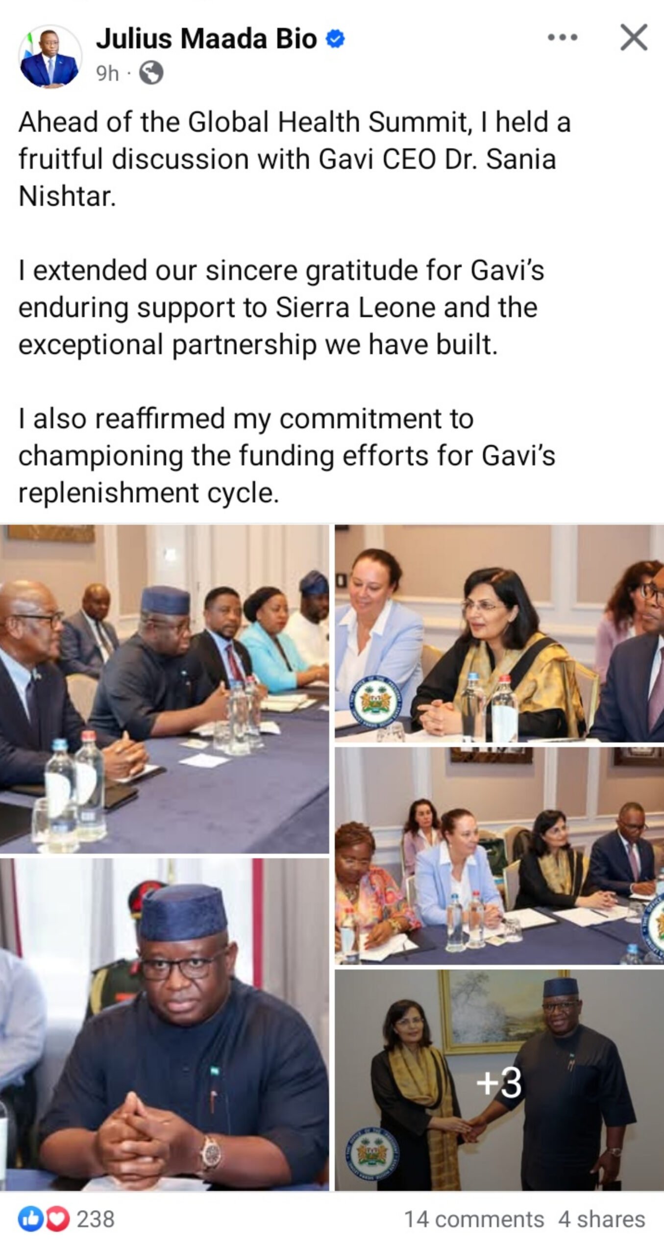 During the meeting, President Bio extended his government’s “sincere gratitude for Gavi’s enduring support to Sierra Leone and the exceptional partnership we have built.”