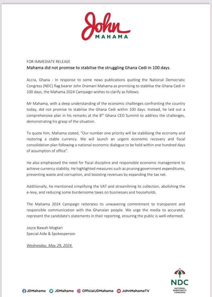 Former President John Mahama’s campaign team has denied media reports claiming that he promised to stabilise the struggling Ghana cedi in 100 days when he assume power for a second term.