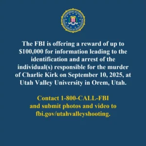 In a separate post, the FBI confirmed the reward, stating it is for “information that can lead to the arrest of the individual(s) responsible for the murder of Charlie Kirk on September 10, 2025, at Utah Valley University in Orem, Utah.” The agency also appealed to anyone with photos or videos from the event to come forward.