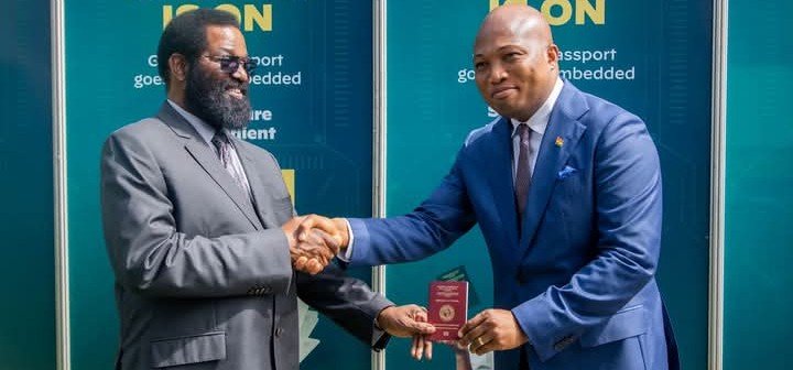 File photo: Ghana’s Foreign Minister, Samuel Okudzeto Ablakwa (right) presenting a passport to a Ghanaian citizen