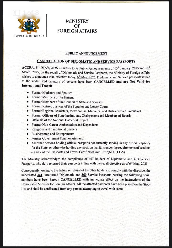 The Government of Ghana through its Ministry of Foreign Affairs and Regional Integration has announced the cancelation of 701 diplomatic and service passports.