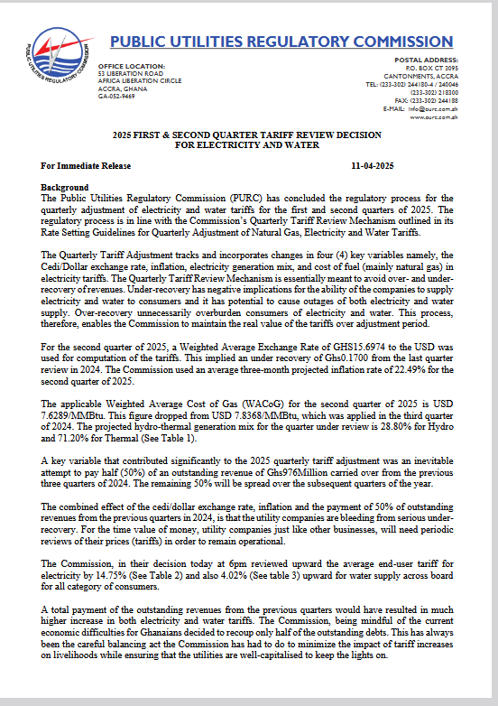 To ease the burden on consumers, the remaining 50% of the outstanding revenue will be spread over subsequent quarters in 2025. The PURC emphasized that the tariff increments are crucial to addressing under-recoveries by utility companies, which could lead to service disruptions if left unaddressed.