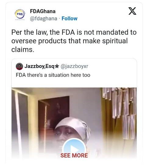 In response to a tweet on X, formerly Twitter, the Authority said “Per the law, the FDA is not mandated to oversee products that make spiritual claims.”