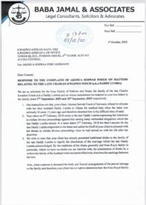 In a letter dated October 1, 2025, issued by Baba Jamal & Associates on behalf of the Fosu Royal Family of Parkoso and Nsuta, the family stated that Akosua Serwaa “has no right to determine how the Fosu Royal family buries their dead.”