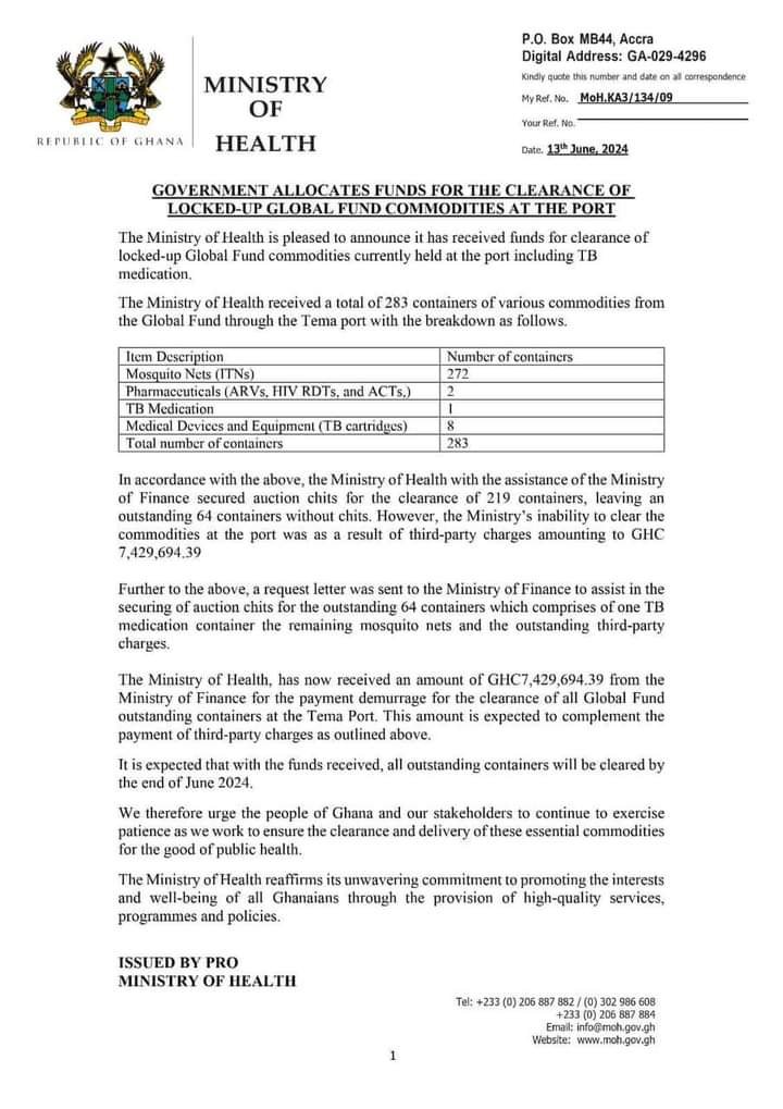 The Government of Ghana says it has allocated funds for the clearance of locked-up Global Fund commodities at the port.
