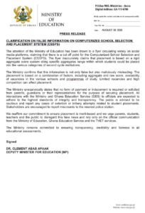 In an official statement signed and issued today, Saturday, August 30, by Deputy Education Minister, Dr. Clement Apaak, the Ministry labeled the information as “misleading and inaccurate.” The statement clarified that the placement process is far more complex and involves a variety of factors.