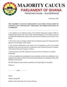 The Majority Caucus, National Democratic Congress (NDC) in Parliament has formally demanded the annulment of the recently concluded parliamentary primary in the Ayawaso East Constituency, citing serious allegations of vote buying and inducement that, it says, undermine the party’s credibility and commitment to ethical politics.