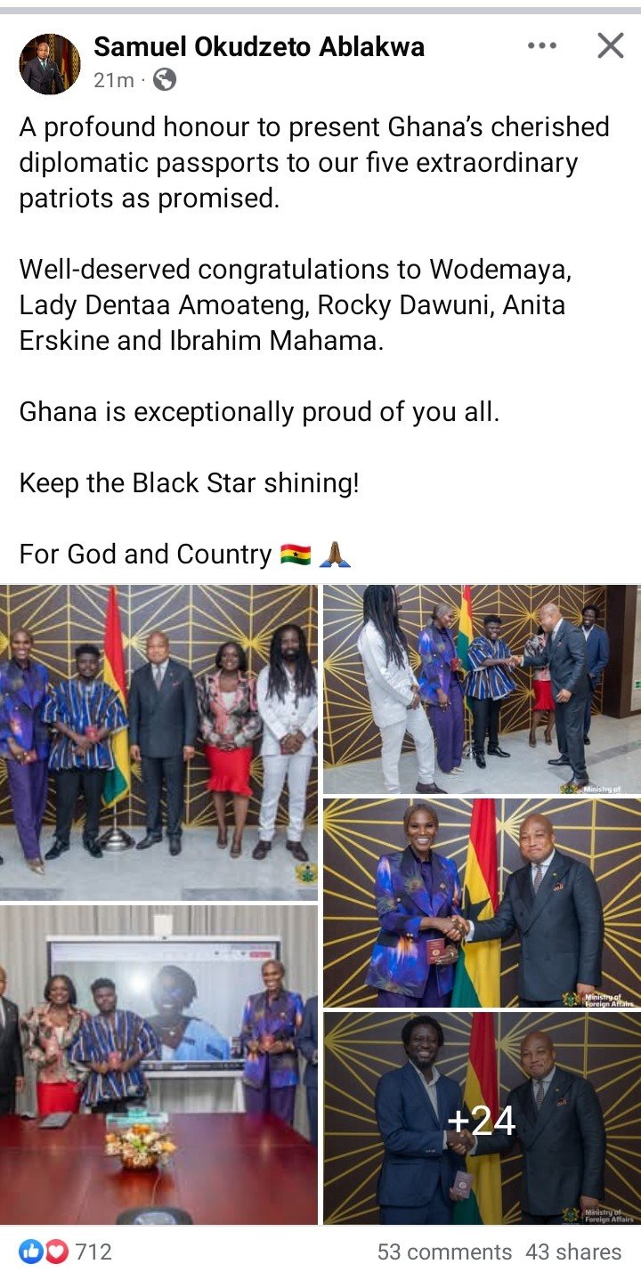 “A profound honour to present Ghana’s cherished diplomatic passports to our five extraordinary patriots as promised”, the Minister said in a post on Facebook, saying