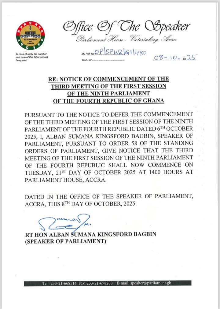 According to Speaker in the notice, “Pursuant to the notice to defer the commencement of the Third Meeting of the First Session of the Ninth Parliament of the fourth republic dated 6th October 2025, I, Alban Sumana Kingsford Bagbin, Speaker of Parliament, Pursuant to Order 58 of the Standing Orders of Parliament, give notice that the third meeting of the first session of the Ninth Parliament of the fourth republic shall now commence on Tuesday, 21st Day of October 2025 at 1400 hours at Parliament House, Accra.”