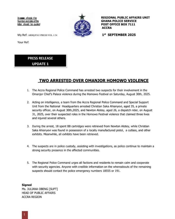 According to the statement, they were arrested for involvement in the Omanjor Chief’s palace violence during the Homowo Festival on Saturday, August 30, 2025.