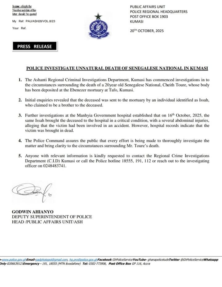 According to the statement dated Monday, October 20, 2025, the Ashanti Regional Criminal Investigation Department has commenced investigation into the circumstances surrounding the death of a 20-year-old Senegalese national, Cheith Toure, “whose body has been deposited at the Ebenezer mortuary at Tafo, Kumasi.”