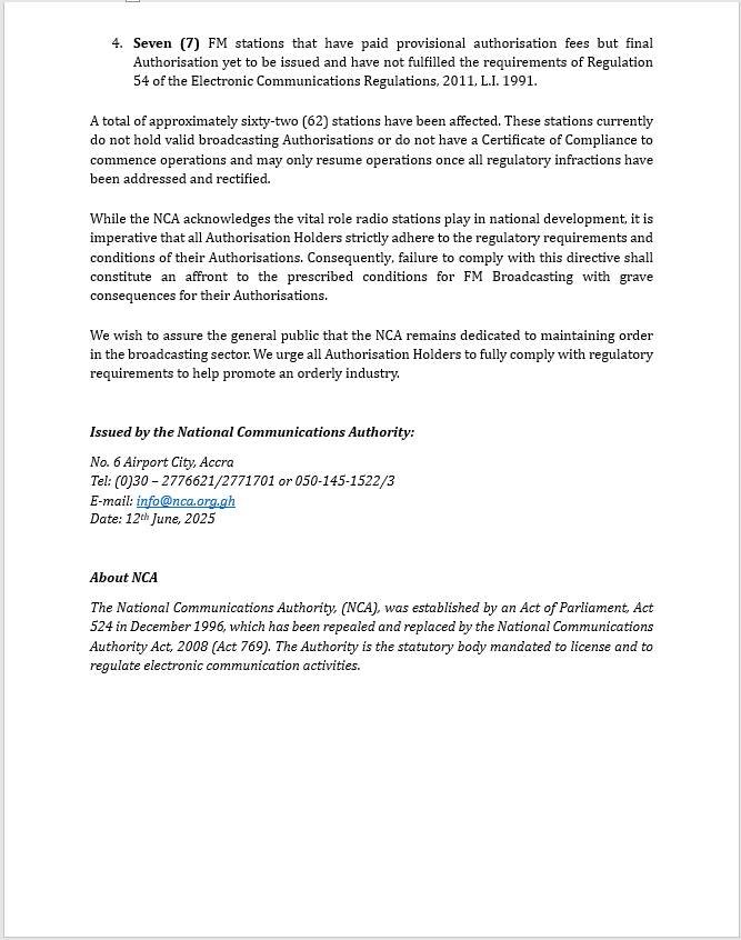 According to NCA in a statement, “a total of approximately sixty-two (62) stations have been affected. These stations currently do not hold valid broadcasting authorization or do not have a Certificate of Compliance to commence operations and may only resume operations once all regulatory infractions have been addressed and rectified.”