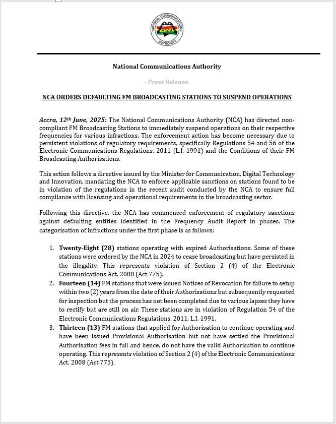The statement says a recent audit by the NCA – backed by a ministerial directive – revealed widespread non-compliance, prompting the suspension aimed at restoring order and adherence to broadcasting standards.