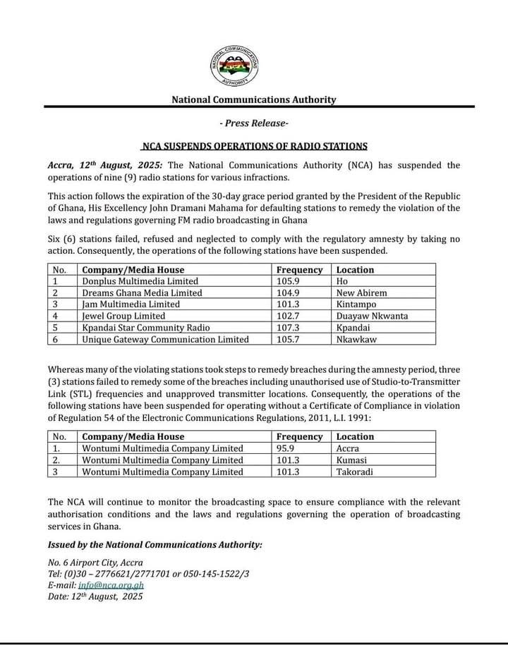 The statement said three other stations were suspended for operating without a Certificate of Compliance in violation of Regulation 54 of the Electronic Communications Regulations, 2011, L.I. 1991.