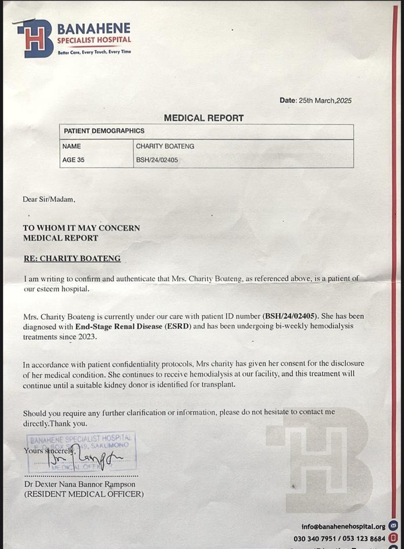 A medical report signed by Dr. Dexter Nana Bannor Rampson, Resident Medical Officer at Banahene Specialist Hospital, confirms that Charity has been diagnosed with end-stage renal disease (ESRD) and has been receiving dialysis since 2023.