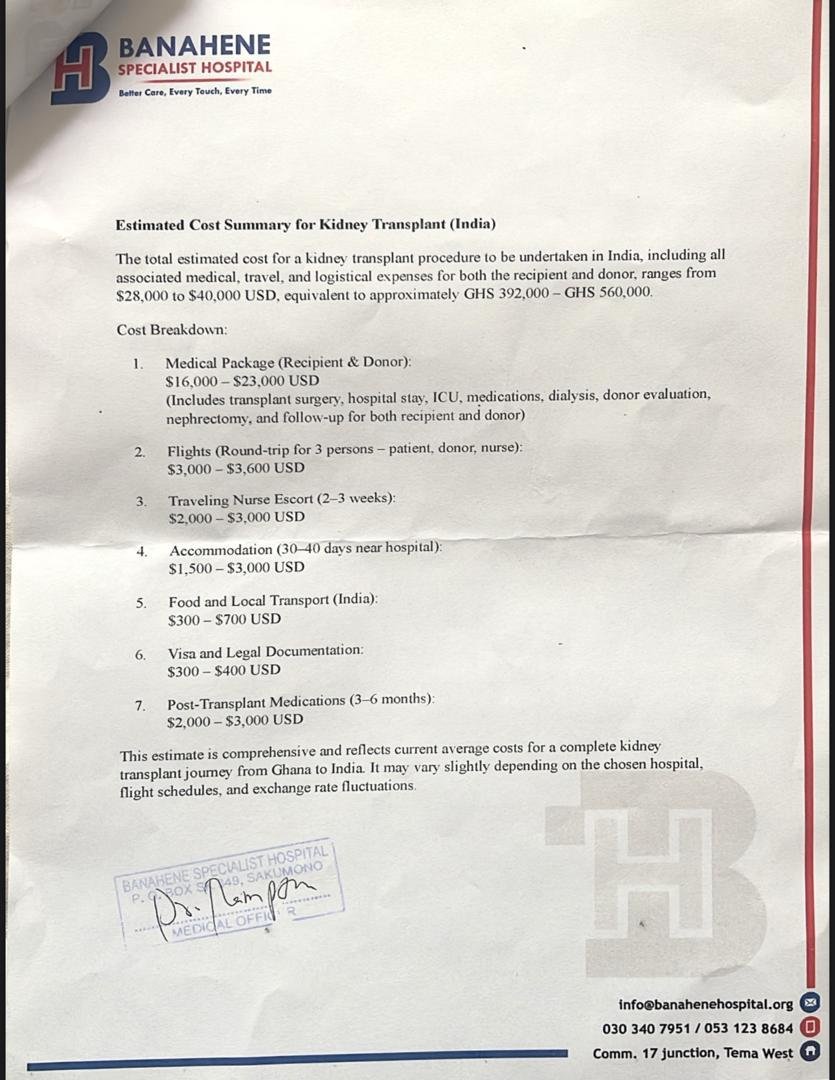 The report estimates the cost of the kidney transplant, to be performed in India, including all medical and logistical expenses for both Charity and the donor, to be between $28,000 and $40,000 USD — approximately Ghc 392,000 to Ghc 560,000.