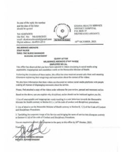 In a statement released on Sunday, October 12, 2025, and signed by Tony Goodman, Head of Health Training Institutions and Spokesperson for the Ministry of Health, the Ministry confirmed awareness of the query letter circulating online. It also commended the GHS for enforcing professional ethics and maintaining the standards outlined in its Code of Conduct.