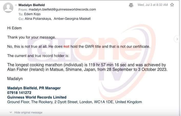 Guinness World Records Limited (GWRL) has stated that Ghanaian chef, Smith, is holding a fake Guinness World Record for the Longest Cook-a-thon.