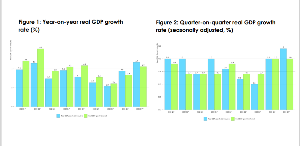 The Ghana Statistical Service (GSS) has announced that the country’s Gross Domestic Product (GDP) is estimated to have increased by 4.7% in the first quarter (January to March) of 2024.