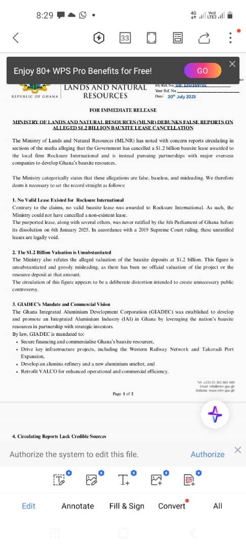 The Ministry of Lands and Natural Resources of Ghana has strongly refuted reports suggesting that the government canceled a $1.2 billion bauxite lease awarded to Rocksure International.