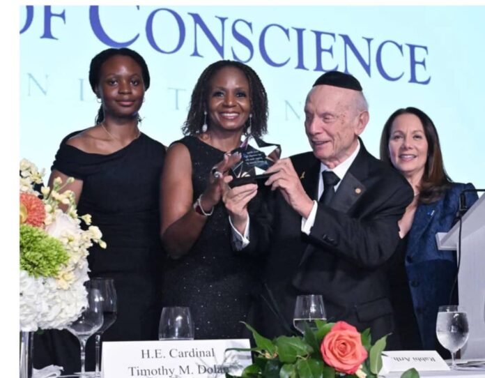 l-r: Daughter of Tony Elumelu, Tiffany Ogo Elumelu; Dr. Awele Elumelu, accepting 2025 Appeal of Conscience Award on behalf of her husband, Tony Elumelu, Group Chairman, United Bank for Africa(UBA) and Founder, Tony Elumelu Foundation; Founder, Appeal of Conscience Foundation, Rabbi Author Schneier; and Executive Vice President, Appeal of Conscience Foundation, Karen Dresback, at the 60th Annual Appeal of Conscience Awards in New York on Monday