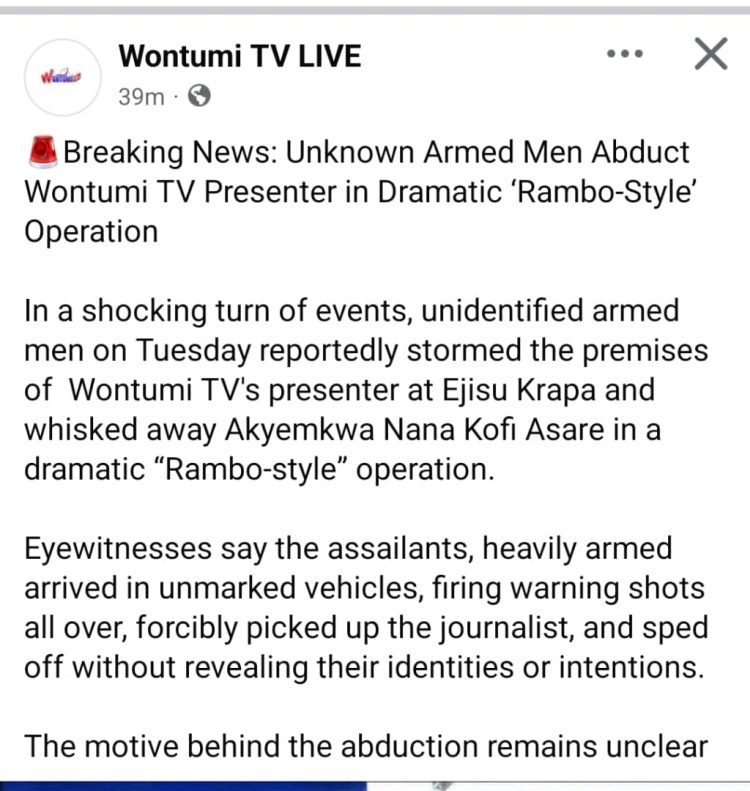 A lawyer for Wontumi Multimedia Company Limited, owners of Wontumi TV which Kofi Asare works with, confirmed the abduction.