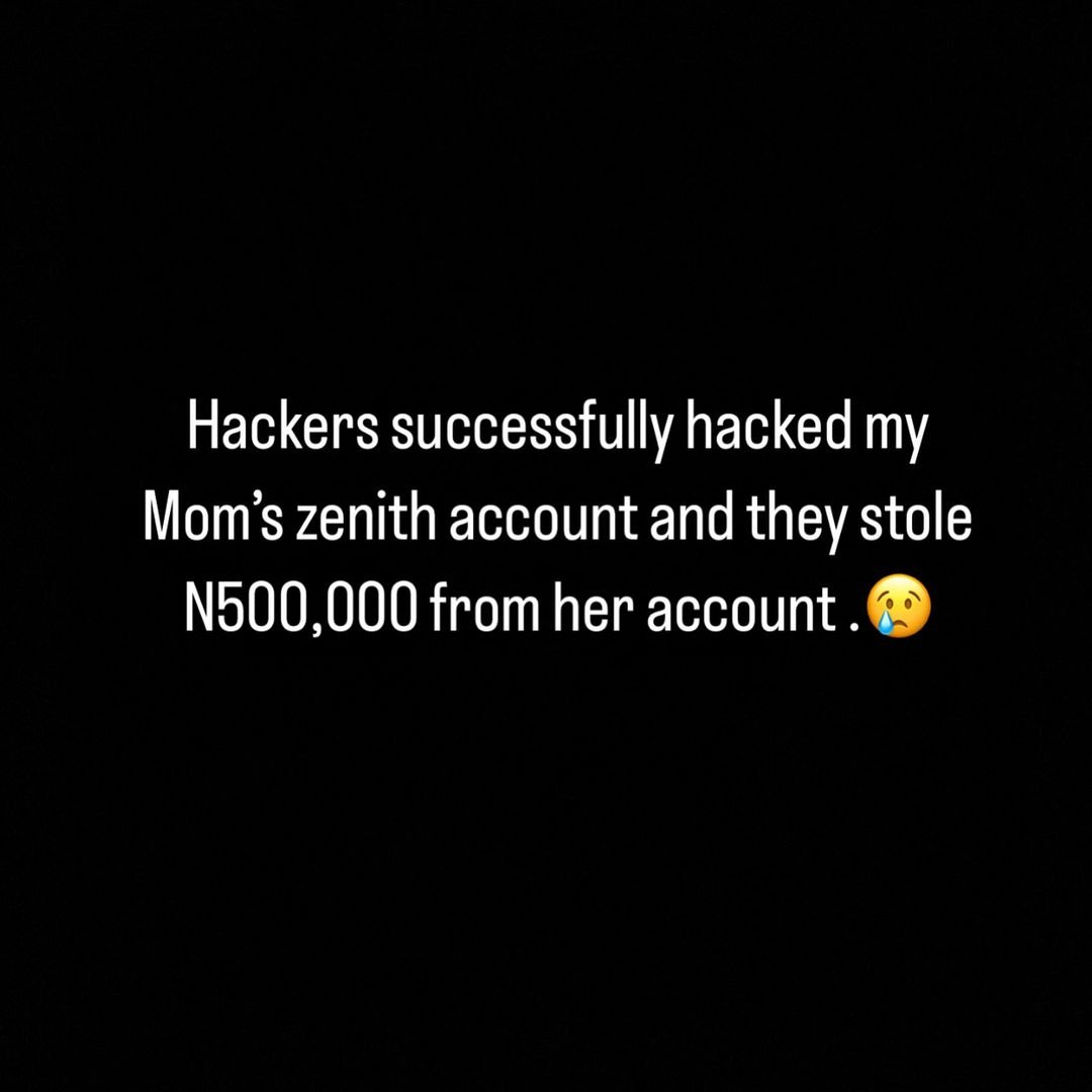 She wrote with a crying emoji, “Hackers successfully hacked my mom’s Zenith account and they stole N500,000 from her account.”