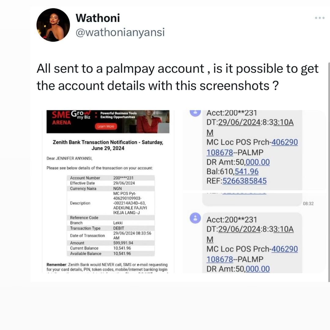 Wathoni Anyansi disclosed that the hackers transferred the stolen N500,000 to a PalmPay account, appealing to her followers to help find details of the PalmPay account used for the fund transfer.