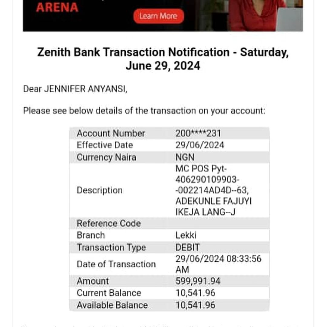 Suspected hackers have allegedly transferred about N500,000 from the Zenith Bank account of Jennifer Anyansi, the mother of popular fashion entrepreneur, Florence Wathoni Anyansi.