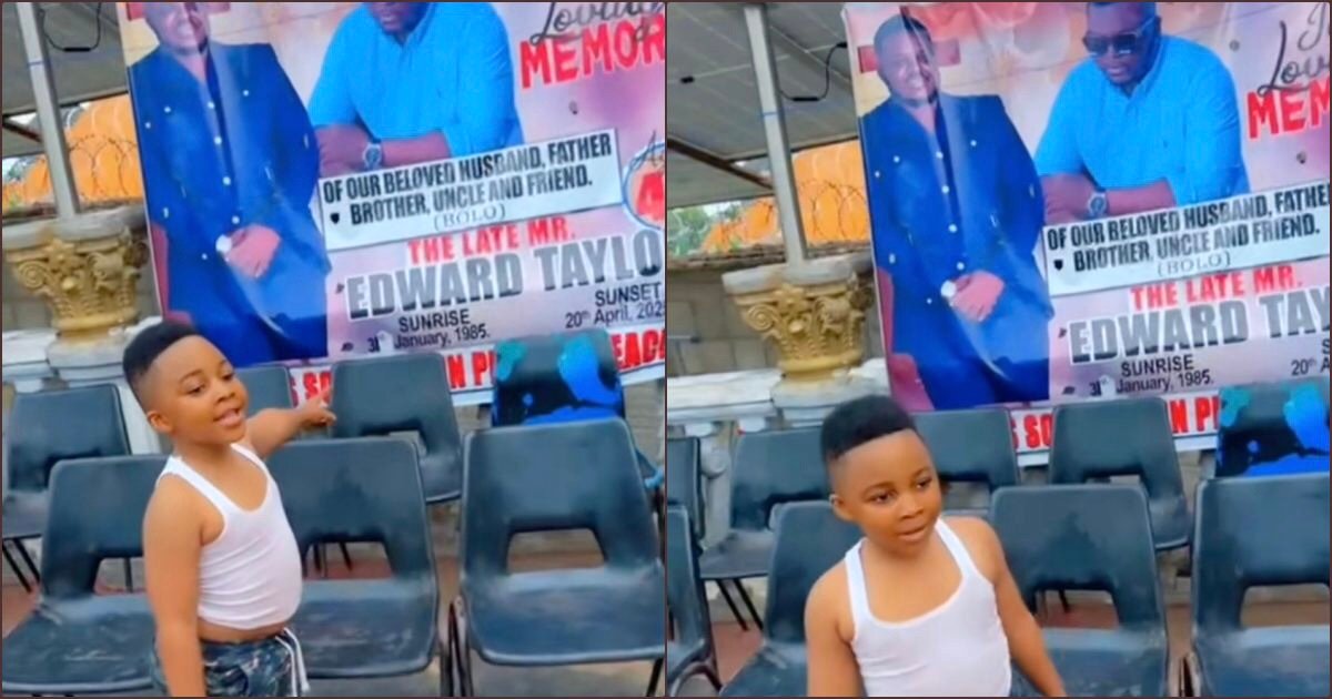 A poignant video has gone viral on social media, capturing the heart-wrenching moment of a young Nigerian  boy joyfully reacted to his late father’s funeral banner, believing it’s a birthday poster. The clip, shared by TikTok user @mamachris917, shows the little boy’s innocent excitement as he spots the large banner in their compound.