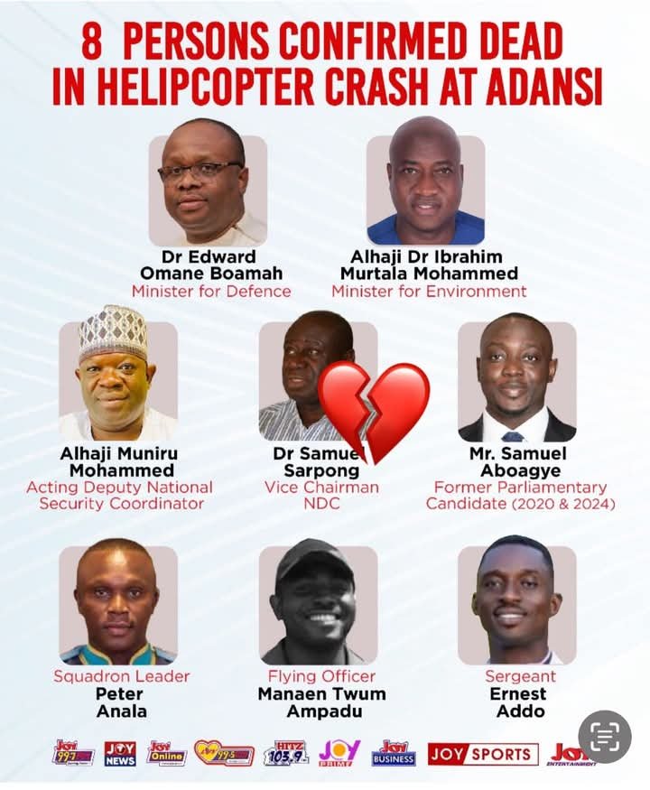 A Ghana Armed Forces helicopter, carrying some of our most dedicated public servants and gallant military personnel, went down in the Ashanti Region. In a single, cruel moment, eight bright lights in our national life were extinguished.