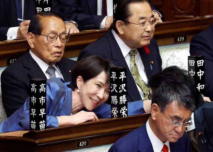 epa12469167 Sanae Takaichi (C) smiles as she chats with fellow lawmakers ahead of the election of the new Prime Minister during the general assembly of an extraordinary parliamentary session in Tokyo, Japan, 21 October 2025. Japan’s ruling Liberal Democratic Party President Sanae Takaichi became Japan’s first female prime minister. EPA/FRANCK ROBICHON